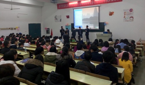 陈军老师一出场就以激昂的问候声带动了全场的气氛,同学们纷纷起立鼓掌欢迎陈军老师的到来,从陈军老师身上独特的气质,我们感受到了这位90后创业梦想家的激情。 期间,陈军老师讲述了他的家庭背景和生活经历,以及他走出大山,闯出属于自己天地的梦想。之后陈军老师又和我们分享了他在大学的创业经历和成功的秘密。陈军老师的演讲十分幽默,妙趣横生,与同学们的互动特别多,尤其“比跑”“背人”“猜牌魔术”等小游戏带动全场气氛,同学都积极参与,书记也连连拍手叫好。最后,全体起立,歌唱国歌,励志爱国创业!
