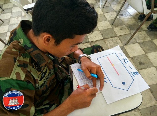 学生们认真听赵老师讲解并动手画肩章图,并简单给赵老师介绍了柬埔寨的军衔等级并与中国的军衔进行对比。讲座结束后,学生们都有很大的收获,学生代表潘苏文说:“作为学汉语的军人,我们应该学习中国的军衔知识,以后看到中国的军官,我们就知道对方的军衔级别了”。(赵军)