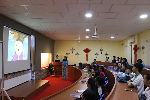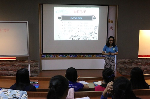 章伟丽老向学生阐释了孔子的思想及《论语》中孔子的教育理念。在讲解孔子的“仁、义、礼、智、信、恕、忠、孝悌”八大思想时,章伟丽老师使用日常生活中的物品举例,语言简洁明了,配合灵活生动的肢体表演与学生进行互动,使学生深入理解孔子的思想理念。章伟丽老师选取《论语》中的名句,结合自身的教学经验和学生的学习生活,创设情境,再现了孔子杏坛讲学的场面,让学生身临其境地感受传统文化的魅力,使其对孔子的形象有更加深刻的了解。最后,两位汉语教师志愿者老师为在场学生播放了孔子与其弟子之间发生的故事的视频,激发了学生对学习了解孔子和中国传统文化的渴望和热情。