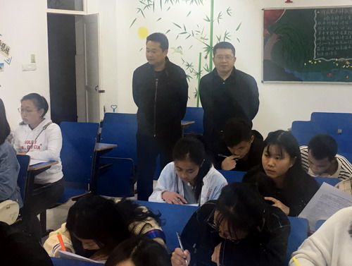 为激发同学们学习外语的热情,提高学生的综合素质,营造积极向上的外语学习氛围,外国语学院于10月28日晚在香远楼开展学科竞赛月活动。外国语学院副院长周志高、教务科科长王伟、夏常利老师一同巡视了整个比赛现场。