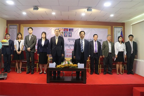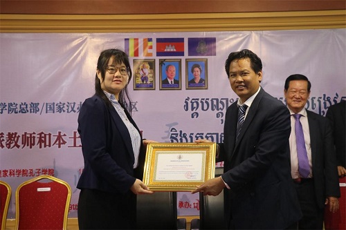 柬埔寨皇家科学院院长宋独(SOK Touch)向孔子学院总部/国家汉办师资处高级项目官员梁征赠送感谢证书