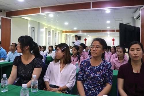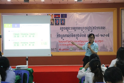 本次培训面向公派教师设置了语音•汉字•词汇专题、跨文化适应能力、教学及课堂管理案例分析和语法专题四门课程。刘谦功老师对汉语学习四要素进行简要凝练的讲解,并关注到公派教师跨文化教学的相关问题。孙红娟老师则对柬埔寨当地的课堂管理中出现的问题,予以针对性的讲解。面向柬埔寨本土教师,此次培训安排了汉语语音教学、利用教材进行有效的汉语教学、汉语词汇教学、HSK考试介绍和课堂管理技巧五个方面的课程。孙红娟老师分享了自己在语音教学、教材使用和课堂管理上的一些心得,刘谦功老师对汉语的词汇教学提出了一些建议。柬埔寨孔子学院公派教师户社芳老师作了HSKK、HSK专题介绍。参与培训的教师们都感到获益匪浅,与两位专家积极展开讨论。