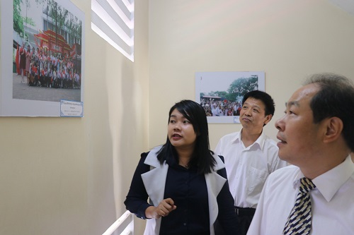 会谈后,九江市代表团在柴克清院长和苏碧娜院长的陪同下参观了孔子学院芳华大楼,柴克清院长和苏碧娜院长向代表团介绍了孔子学院教室、电子图书馆、会议室等设施以及孔子学院开展的一系列文化活动。期间,潘熙宁部长与孔子学院工作的汉语志愿者教师亲切交流,了解了汉语教师志愿者们的大致情况,并进入教室与在孔子学院学习的柬埔寨学生进行交流,鼓励其来中国学习,该学生对潘熙宁部长的鼓励表示十分感谢。