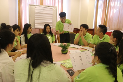 22日上午,柬埔寨皇家科学院秘书长杨博(YANG Peou)博士、中华人民共和国驻柬埔寨王国大使馆政治处主任王德鑫先生、中国孔子学院总部/国家汉办项目官员来永梅女士、柬埔寨柬华理事总会常务副会长兼文教师资基金处处长郑棉发勋爵、柬埔寨皇家科学院孔子学院柬方院长苏碧娜女士(VUTH Sopheakna)等领导莅临开幕式现场并致辞。随后,禹志云教授首先向志愿者们介绍了课堂游戏教学法,强调了对外汉语课堂上游戏对于学生的角色认同与移情体验的重要性,并分类介绍了“传音壁”“生词接龙”等切实有效的教学游戏。林秀琴副教授则向大家讲解了如何设计以学生为中心的教学活动,林老师说,“课堂应是活动的、交际的、创造的课堂,教师要用活动引燃你的课堂,让学生多多参与进来。”两位专家的讲课对志愿者老师们的启发很大。下午,志愿者们分别按照“风景名胜组”/“高棉精灵组”分组互动,分享彼此的教学游戏法。短短一个下午,每位志愿者教师就学习到了30个教学游戏,收获满满。