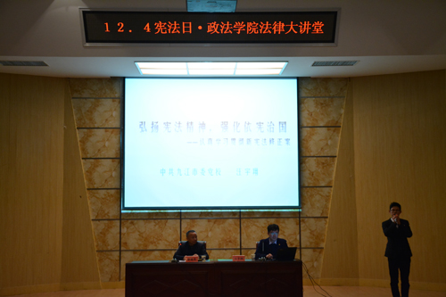 12月4日是国家宪法日,今年宪法又进行了第五次修正,为展开宪法宣传、弘扬宪法精神,九江学院政法学院邀请了九江市委党校老师汪宇翔在九江学院八里湖校区综合楼报告厅举办了“弘扬宪法精神,强化依宪治国”专题宪法讲座,此次讲座由政法学院副院长李德恩主持,学生科团委老师和同学们积极参加。