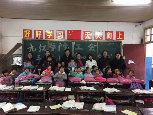 12月7日上午,伴随着绵绵冬雨,凛凛寒风,遵照校领导的指示,校工会主席金葆金和马丽君老师、王若宇老师一同前往我校扶贫点武宁县官莲乡东山村小学,为该校的25名学生送去了充满温暖的爱心书包。