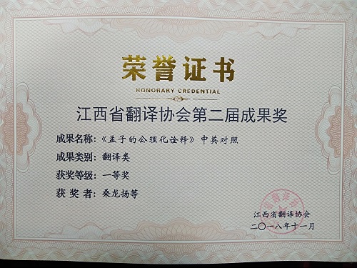 桑龙扬教授等翻译的《《孟子》的公理化诠释》获得江西省第二届翻译成果奖中的译作类一等奖。
