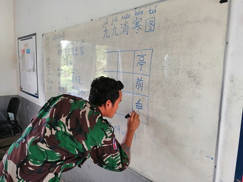 紧接着,崔晨晨老师和学生们一起诵读了唐代诗人白居易的诗歌《邯郸冬至夜思家》。“想得家中夜深坐,欢迎说着远行人”一句,军人学员们纷纷点头表示理解。随后,学生们和崔晨晨老师一起体验了一种清代的冬至民俗———“九九消寒图”。写“九九消寒图”,也称“写九”,格纸上一共九个字,每字九划,一天写一划,九九八十一天后,冬去春来,寒冷也就“消”去了。崔晨晨老师示范了每个字的笔顺笔划,并请九名学生一一在白板上“写九”消寒,体会中国古人的古意古韵。此外,崔晨晨老师还组织学生们一起合唱了冬至民谣《九九歌》,让学生们进一步了解了中国“冬至日”的文化民俗。