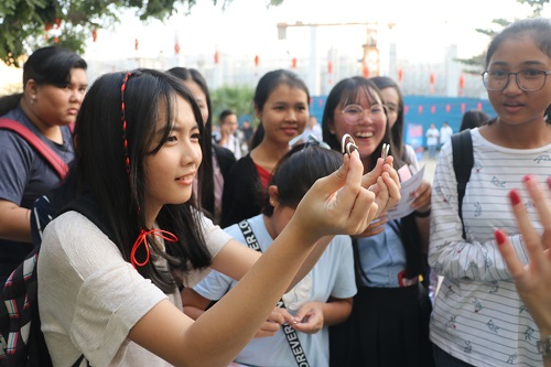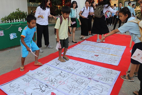 本次活动由转盘抽奖开始,学生们通过扫描二维码关注柬埔寨皇家科学院孔子学院微信公众号和Facebook的方式参与红包抽奖,小小的红包灌注着一整年的幸运。趣味运动会则分为十个项目:孔明锁、投壶、单腿斗鸡、跳绳、绕口令、踩汉字、抢凳子、丢福袋、踢毽子和吹水墨画。每一个都是来自中国的童年经典游戏,学生们一会儿在投壶馆前排起了长队,一会儿在桌子前认真地端详孔明锁,一会儿和小伙伴们一起抢坐凳子,兴致勃勃,不亦乐乎。学生们积极参加活动,兴奋地在不同的场馆收集不同的印章,并拿着赢取的积分卡到礼品台换取心仪的礼物,场面热闹非凡。
