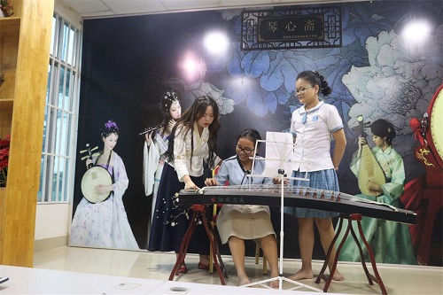 十八班武艺,孔院老师样样精通。在图书馆琴心斋,黄书老师首先为学生们弹奏了最新热门曲目《雪落下的声音》和《知否知否》,学生们被奇妙优雅的古筝声乐吸引,弹奏完毕后,现场沸腾了,学生们大赞老师琴艺精湛。围着老师,听她讲解古筝的构造、基本音符、音区和指法等乐理知识,有两位学生在老师的指导下尝试了《雪落下的声音》第一段,得到老师的肯定后,兴奋地欢呼拥抱。学生们希望以后孔子学院开一些关于古筝、书法、绘画等中华文化体验课程,从而进一步了解和体验中国文化!(文|魏梦莉 摄|温天凤)