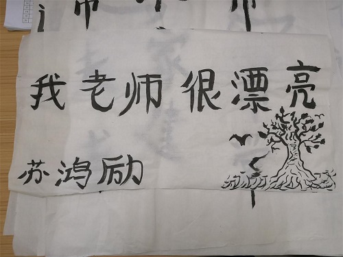 初级C班一考完试就开始了他们的书法活动,小小的个子掂着长长的毛笔,跟着老师一笔一画书写的样子,简直萌翻了。过了很久一个小姑娘害羞的将写好的书法送给老师“我的老师很漂亮!”淘气的男孩子直接表白“我喜欢老师!”还有“我爱老师,老师真可爱!”穆晓彤老师收到学生们的表白,激动地向其他老师们分享炫耀。