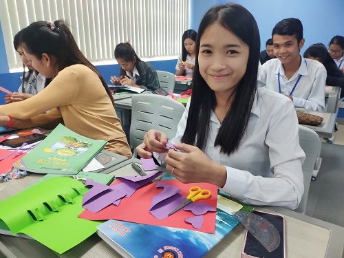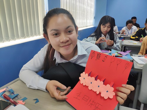 为庆祝柬埔寨皇家科学院孔子学院成立十周年,柬埔寨皇家科学院孔子学院银行学院汉语中心于2019年12月19日举办了主题为“春秋十载,祝福与期待”的文化活动。此次活动以制作贺卡和歌唱作为主要内容,由银行学院汉语中心汉语教师志愿者苏晓君策划、组织,银行学院初级中午班全体同学参加。