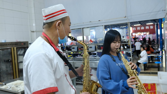 “九江学院的同学不仅素质高,还热爱学习,有些同学在没事的时候还会带自己的乐器来找我切磋探讨。在我吹萨克斯的时候,还有同学给我伴唱。”