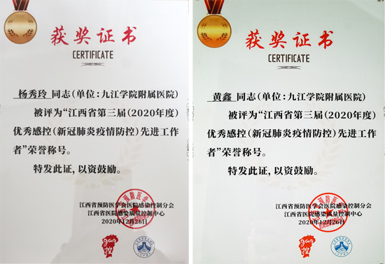 近日,由江西省预防医学会医院感染控制分会和江西省医院感染质量控制中心主办的“2021年江西省医院感染质量控制中心工作会议”在赣州隆重举行。会上公布了“江西省第三届(2020年度)优秀感控(新冠肺炎疫情防控)先进工作者”评选结果,九江学院附属医院院感科杨秀玲、黄鑫获江西省“优秀感控先进工作者”荣誉称号。