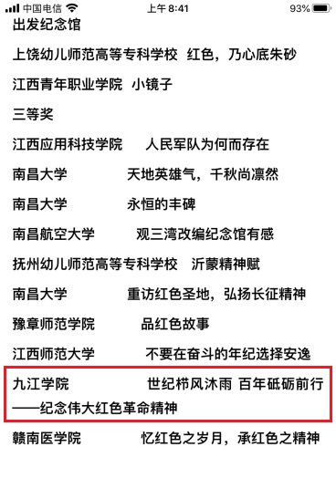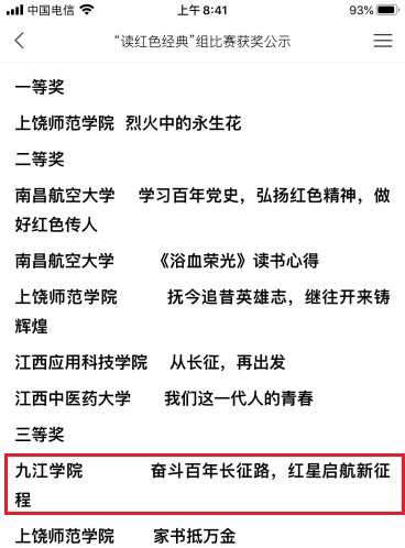 4月30日,第三届江西省高校图书馆超星杯“红色品读”作品征集活动省级赛评审结果出炉,我校推荐的文字作品《奋斗百年长征路,红星启航新征程》 (作者:教育学院A2032曾馨颖)和视频作品《世纪栉风沐雨 百年砥砺前行——纪念伟大红色革命精神》(作者:会计学院A1927黄蓓等)分别获得“读红色经典”组别三等奖和“品红色故事”组别三等奖。