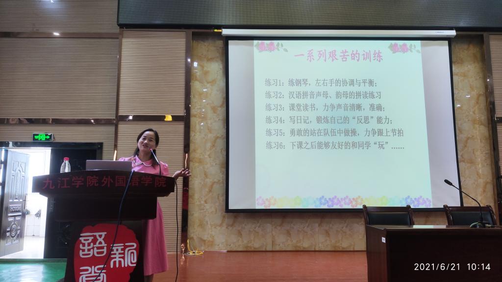 开班仪式后,受九江学院邀请,九江小学德育处主任、小学特高级教师钱琪老师为全体参加实习支教同学做“小学师德师风”专题报告。钱琪老师结合自己20多年的小学从教经历,用丰富的案例诠释了一名优秀的小学教师所应具有的师德风范。