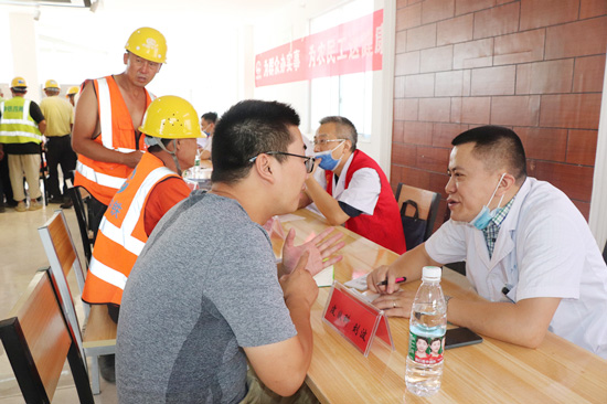 9月25日上午, 在濂溪区中国中铁四局集团义诊活动现场,附属医院各科专家及护理骨干人员积极开展诊疗工作,热情接待前来咨询的工友,耐心为其解答疑问,还免费提供了测血糖、量血压等服务,为工友们做基本的健康查体,并针对检查出来的结果做相应的健康宣教,提高了工友们的健康意识。
