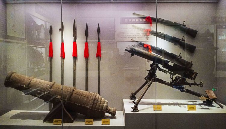 二楼陈展区分为“危难中奋起”“霹雳一声暴动”“转兵井冈山”和“永远的光荣”四大部分,以红色为基调,分别向我们展示了秋收起义的准备工作、详细过程与后续转折。陈展区用大量珍贵的历史资料,以时空为序,系统地展现了有关历史人物、革命旧址及战斗遗址,再现了94年前工农暴动的情景。玻璃展柜里,陈列着红军穿过的草鞋、使用的大刀、土枪、土炮,让我们再次近距离感受到了当年秋收起义的艰苦与激烈。伫立在大炮面前,看着上面一道道的划痕与锈迹,学生代表们不禁感叹道,“在武器装备差距这么大的情况下,革命先辈们这是怎样的无所畏惧和牺牲奉献精神才换回今天的和平与幸福。”