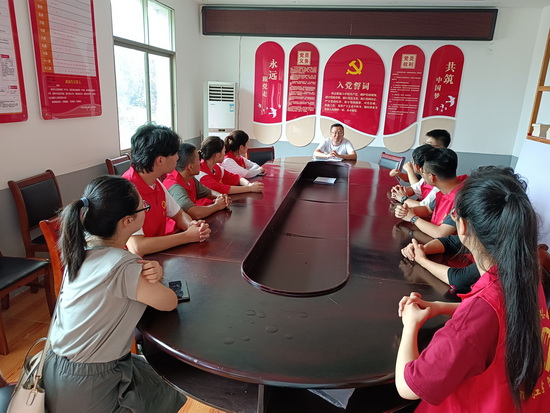在双新村党群服务中心,九江学院驻村干部双新村第一书记胡亮为实践队讲授了一堂生动的“活”红色课堂。他以其自身为例,跟大家分享了作为驻村干部的故事。胡亮听从党的号召,肩负振兴乡村的使命,带着病妻来到双新村驻村。他带领村里发展种植产业,关心村里脱贫户,帮助村民找路子销售农副产品。这堂课,让同学们了解了双新村乡村振兴背后的故事与努力,不仅让学生接受了党性修养教育,要始终听党话、跟党走,也让大家进一步明白了群众路线的重要性,要始终把为群众办实事放在心坎上。