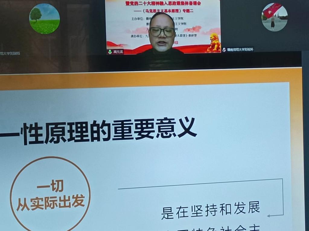 为深入学习贯彻党的二十大精神和习近平总书记在学校思想政治理论课教师座谈会上的讲话精神,进一步推进“大思政课”试验区建设,提高思政课教学效果,在中共江西省委教育工委宣传部、江西省教育厅社政处的统一指导下,3月8日下午,我校马克思主义学院举办了全省高校《马克思主义基本原理》课(专题二)问题式专题化团队教学改革暨党的二十大精神融入思政课集体备课会。我校全体《原理》课程主讲教师、赣南片区、景德镇片区、九江片区等高校近100位《原理》课教师线上线下参加会议。教育部全国高校思政课教指委“马克思主义基本原理”分教指导委员、湖北大学马克思主义学院院长熊友华教授出席线上视频会议,并作指导点评。