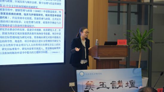聘任仪式结束后,杨冰香主讲了题为《国家自然科学基金申报趋势分析及申报书撰写要点》的学术讲座,她结合自身成功中标国家自然基金青年项目、面上项目的经验和准备,以及成功培育团队其他成员获得国家自然基金项目立项的经验,分享申报准备过程、科研的初心和坚持、基金申报渠道和途径分析、基金申报趋势发展以及标书撰写的要点等经验。整场讲座持续近2小时,与会人员均表示受益匪浅。