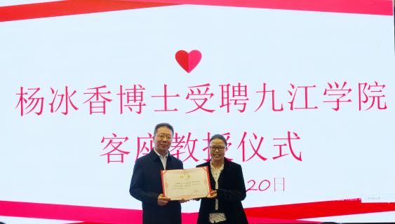 聘任仪式上,严平代表学校向杨冰香博士颁发了客座教授的聘书,对她的到来表示热烈欢迎,同时对她对学校护理学科建设发展的无私贡献表达了感谢。他说,希望在杨冰香副院长的指导和帮助下,九江学院护理学科建设和教学科研水平能够得到稳步提升,护理学院的全体同仁们以及医学院和各附属医院的护理同仁们能抓住这一机遇,争取在国家级课题上有所突破,共同将九江学院护理学科建设成为省内一流、国内有影响力的学科。