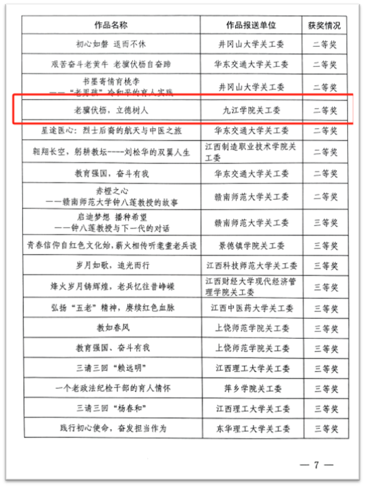 同时,江西省教育厅关工委公布了2024年我省高校“读懂中国”活动评审结果,我校参赛的14篇征文作品中9篇获奖和2个微视频作品全部获奖,微视频获奖率高达100%,征文获奖率达64.2%,其中,文学院选送的《几十载春风化雨,弦歌不辍育青葱》获征文类一等奖,护理学院、旅游学院、文学院、材料科学与工程学院、基础医学院、计算机与大数据科学学院等选送的作品分别荣获二、三等奖,基础医学院选送的《承前人之志,启后世之师——白大褂下的使命感》获微视频类一等奖,文学院选送的《老骥伏枥,立德树人》获微视频类二等奖。