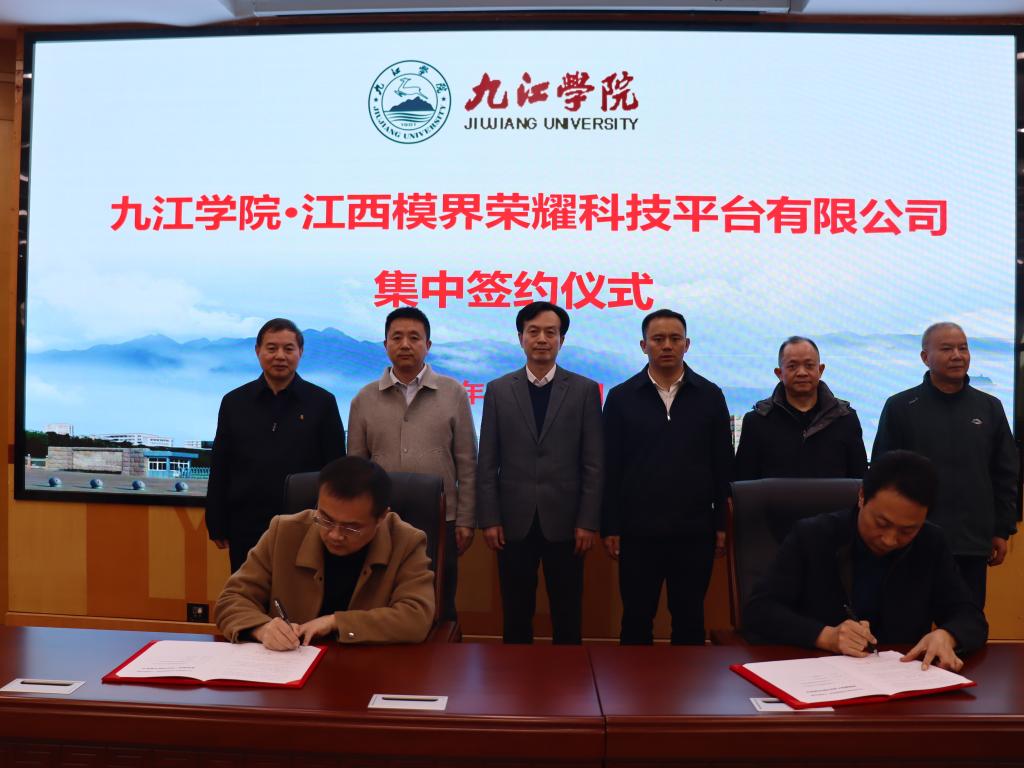 为深入贯彻省委“三大高地、五大战略”和九江市“三大攻坚行动”部署要求,落实学校“3353战略”与“十百千”社会服务体系建设,12月12日上午,九江学院与江西模界荣耀科技平台有限公司集中签约仪式在学校行政楼四号会议室举行。九江学院党委委员、副校长吴维勇出席签约仪式,江西模界荣耀科技平台有限公司总裁刘晓龙、总经理吴志成,修水县产业服务中心主任周正根,学校科研处、发规处、机械与智能制造学院、材料科学与工程学院、计算机与大数据学院、电子工程学院负责人及师生代表参加活动。