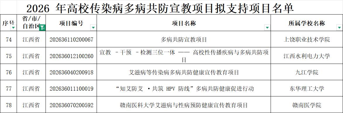 近日,中国性病艾滋病防治协会公布“2026年高校传染病多病共防宣教项目拟支持名单”,由校医院组织申报的全国高校传染病“多病共防健康宣教项目”成功入选(全省高校共5个项目入选)。
